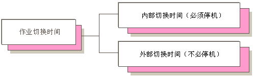 如圖所示,品種(作業(yè))切換時(shí)間主要可以劃分為內(nèi)部切換時(shí)間和外部切換時(shí)間。在JIT方式下,流水線的換線只需要將新的產(chǎn)品送到第一個(gè)工序,后面跟著生產(chǎn)線流動(dòng),這樣就能順利地完成換線。因此,流水線的換線屬于外部切換,不需要停機(jī),切換時(shí)間較短。但是,模具、刀具和工裝夾具等的切換必須停機(jī),流水線將會(huì)中斷。