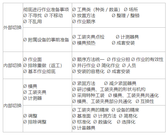 “一個(gè)流”生產(chǎn)的關(guān)鍵是如何縮短品種切換的時(shí)間。如表所示,為了縮短品種切換時(shí)間,就需要注意一系列的要點(diǎn)。對(duì)于外部切換,主要是要徹底進(jìn)行作業(yè)準(zhǔn)備和附屬設(shè)備的事前準(zhǔn)備;對(duì)于內(nèi)部切換,則可以通過規(guī)范和簡化基本作業(yè)、標(biāo)準(zhǔn)化模具以及相應(yīng)的調(diào)整來縮短切換時(shí)間。