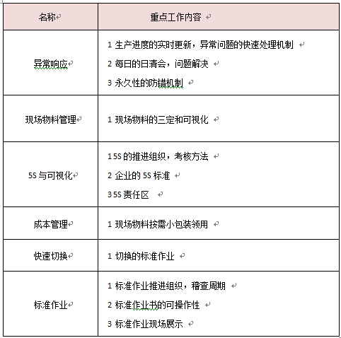 在這里還是要再次強調一下,現場標準化模塊的工作內容與一般現場管理的內容是有差異。此6大要素是根據我們個咨詢經驗所總結出來的、當今國內大多數企業的現場管理上疏忽或未管控到位的主要工作。所以包括以下各大模塊要素分解中沒有提到的工作不代表不重要,只是我們沒有把那些工作作為重點罷了。