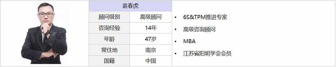 專注于精益生產(chǎn)領(lǐng)域的研究與運(yùn)用。系統(tǒng)掌握精益生產(chǎn)理念和技術(shù)。擅長(zhǎng)啟發(fā)性教育,嫻熟運(yùn)用TOYOTA KATA進(jìn)行精益人才育成;擅長(zhǎng)6S、TPM、精益生產(chǎn)理論講授,現(xiàn)場(chǎng)輔導(dǎo)落實(shí),以技術(shù)性改善為基礎(chǔ)實(shí)施全面改善;在咨詢實(shí)踐中注重結(jié)合陽明心學(xué)以及精神分析的理論,秉持人文關(guān)懷、重視員工個(gè)人發(fā)展。