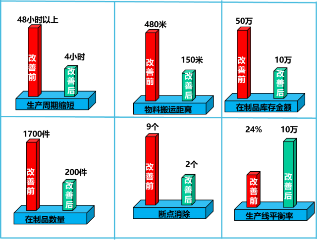 “如果你不能迅速把產(chǎn)品開(kāi)發(fā)時(shí)間減半、訂貨時(shí)間減少70%、生產(chǎn)周期縮減90%,那你一定是哪兒做錯(cuò)了”。因此,為了縮短生產(chǎn)周期,車(chē)間以組建生產(chǎn)線、工序間改善為抓手,著力實(shí)現(xiàn)生產(chǎn)周期優(yōu)化。通過(guò)打破班組間壁壘,再造生產(chǎn)組織,整合4個(gè)班組到1個(gè)班組,將10個(gè)生產(chǎn)工序拉成新的生產(chǎn)線,降低產(chǎn)線瓶頸工序時(shí)間,消除過(guò)程等待浪費(fèi)。產(chǎn)線重組消除了從下料到裝配搬運(yùn)浪費(fèi),單件周轉(zhuǎn)距離從480米減少至150米,周轉(zhuǎn)次數(shù)由6次降為1次,斷點(diǎn)9個(gè)降為2個(gè),生產(chǎn)周期從48小時(shí)降至4小時(shí)。