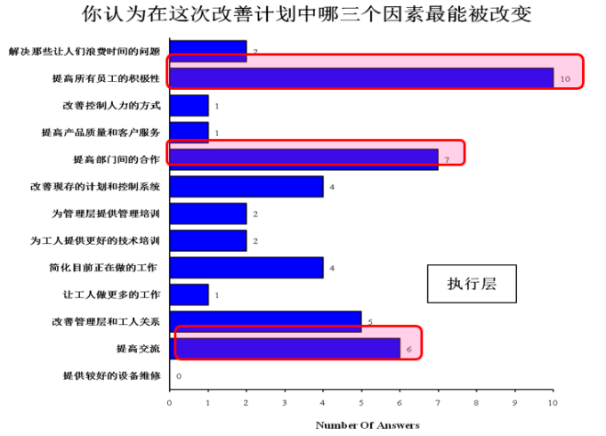 結論:員工和管理人員在“積極性” “管理風格” 方面認同感和滿意度最差, 全員“改進導向”比較強烈,說明大家希望變革。