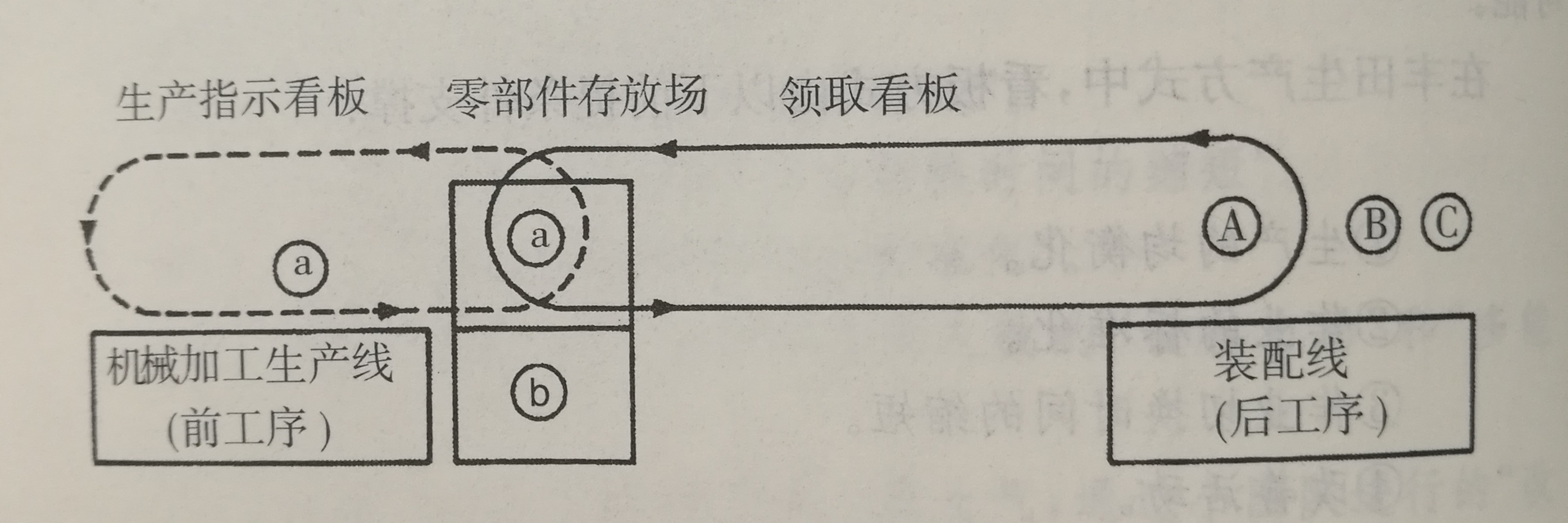 現在,假設某條裝配線正在生產A、B、C三種產品。生產這些產品需要的零件是a和b,這些零件在作為前工序的機械加工生產線生產(參看圖1.3)在機械加工生產線生產的零件a、b存放在該生產線的零部件存放場,掛著該生產線的生產指示看板。
