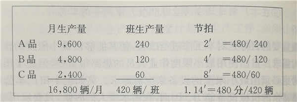 在這里,節(jié)拍時間是用一個班也就是480分鐘的生產量去除一個班的時間480分鐘得出的。根據這個計算結果,A品2分鐘生產一輛,B品4分鐘生產一輛,平均下來用1.14分鐘生產一輛即可。