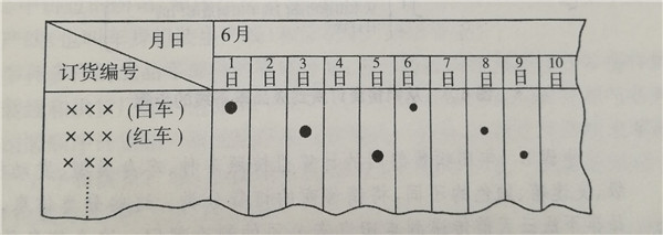 步驟1 來自銷售商的旬訂貨,各銷售商在汽車廠基本生產計劃確定的本月領取輛數的范圍內,將最終分規格的10天份的訂貨在7天至8天前通過微機聯網提供給汽車廠的銷售部門(參看圖1)。所謂最終規格,就是將剛才講過的按大分類的規格的車型,進一步通過對任選部件(訂貨要求的裝備)的選擇、車的顏色的選擇細分后的規格。接著,在生產管理部門按照旬訂貨來計劃分工廠,分生產線的日產量,這就是對前面所講述的基本生產計劃的修正,另外,豐田汽車公司還要向各家銷售商報告圖2那樣的配送預定表( Delivery Schedule),這個預定表的編制,從接受旬訂貨開始需要兩天的時間。